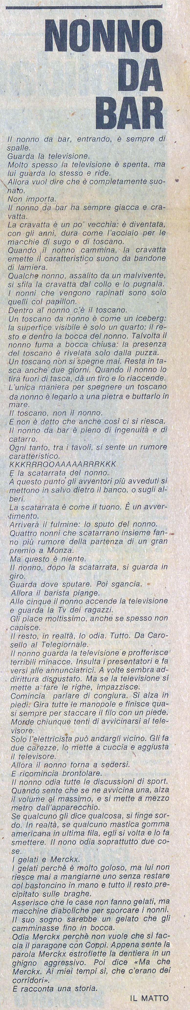 Ma se il quotidiano si conquista qualche merito in un così breve lasso di tempo, a questi va sicuramente ascritto quello di avere ospitato un buon numero di racconti di Benni che poi confluiranno in Bar Sport. Ne forniamo di seguito un elenco (cliccando sul titolo è possibile leggere l’articolo):