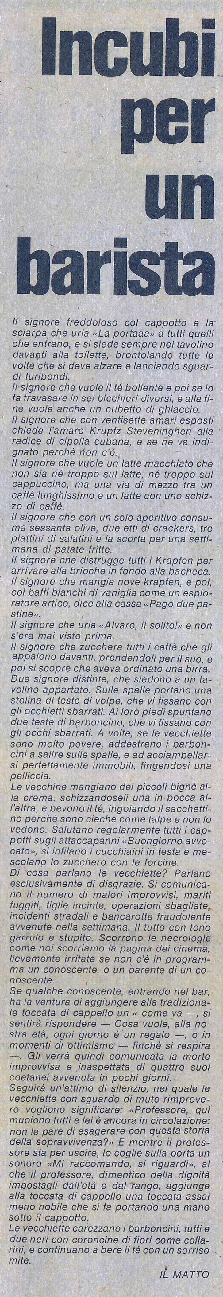 - Incubi per un barista (17 agosto 1975): fra questi incubi ci sono Le due anziane signore alle quali è intitolato un paragrafo del capitolo Comparse. In Bar Sport duemila, di cui parleremo in conclusione di questa gallery, assistiamo a Il ritorno delle vecchiette nell’angolino.