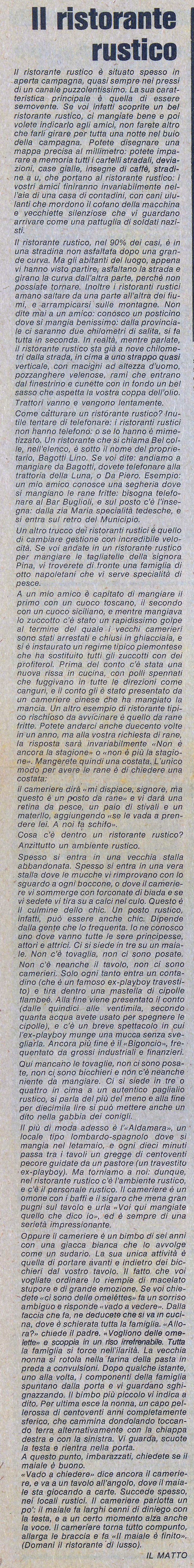 - Il ristorante rustico (9 settembre 1975): in Bar Sport è il titolo della prima parte del racconto «Conosco un posticino». Nell’ultima riga di questo articolo si annuncia la pubblicazione l’indomani di un pezzo sul ristorante di lusso. Non ne abbiamo trovata traccia né sul numero del 10 settembre né su altri fascicoli del quotidiano. In Bar Sport il pezzo viene recuperato e Il ristorante di lusso è il titolo della seconda parte del racconto citato.