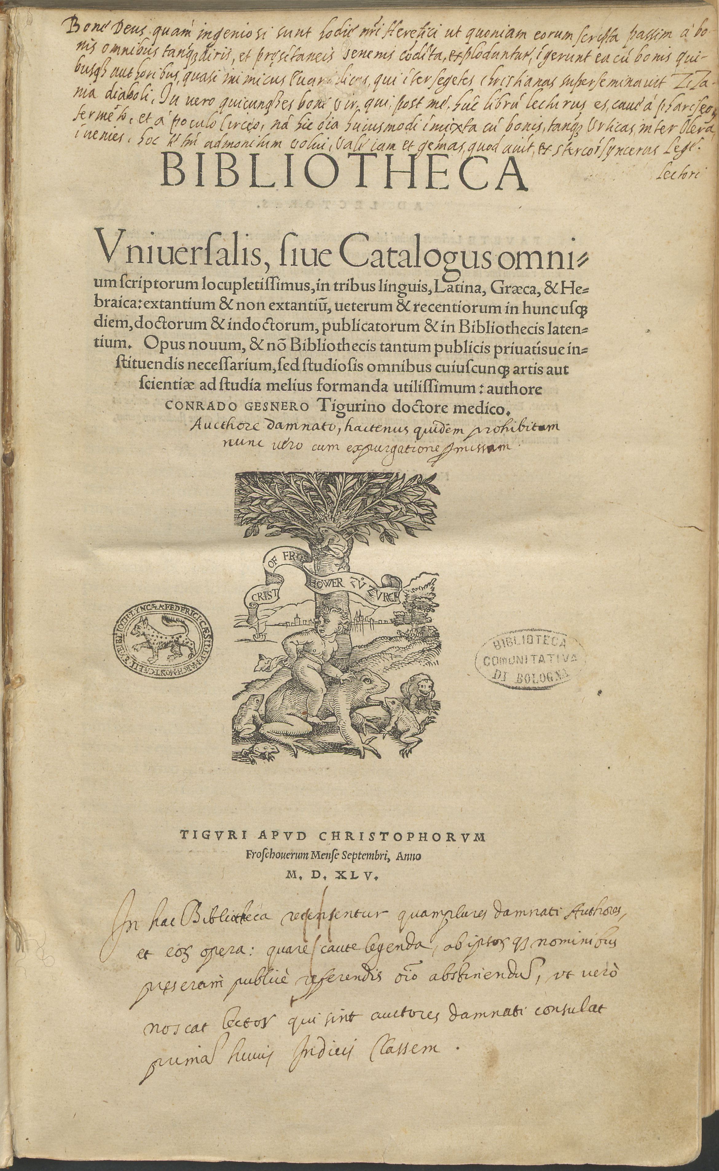 Konrad Gesner, Bibliotheca universalis…, Tiguri, apud Christophorum Froschouerum, 1545.