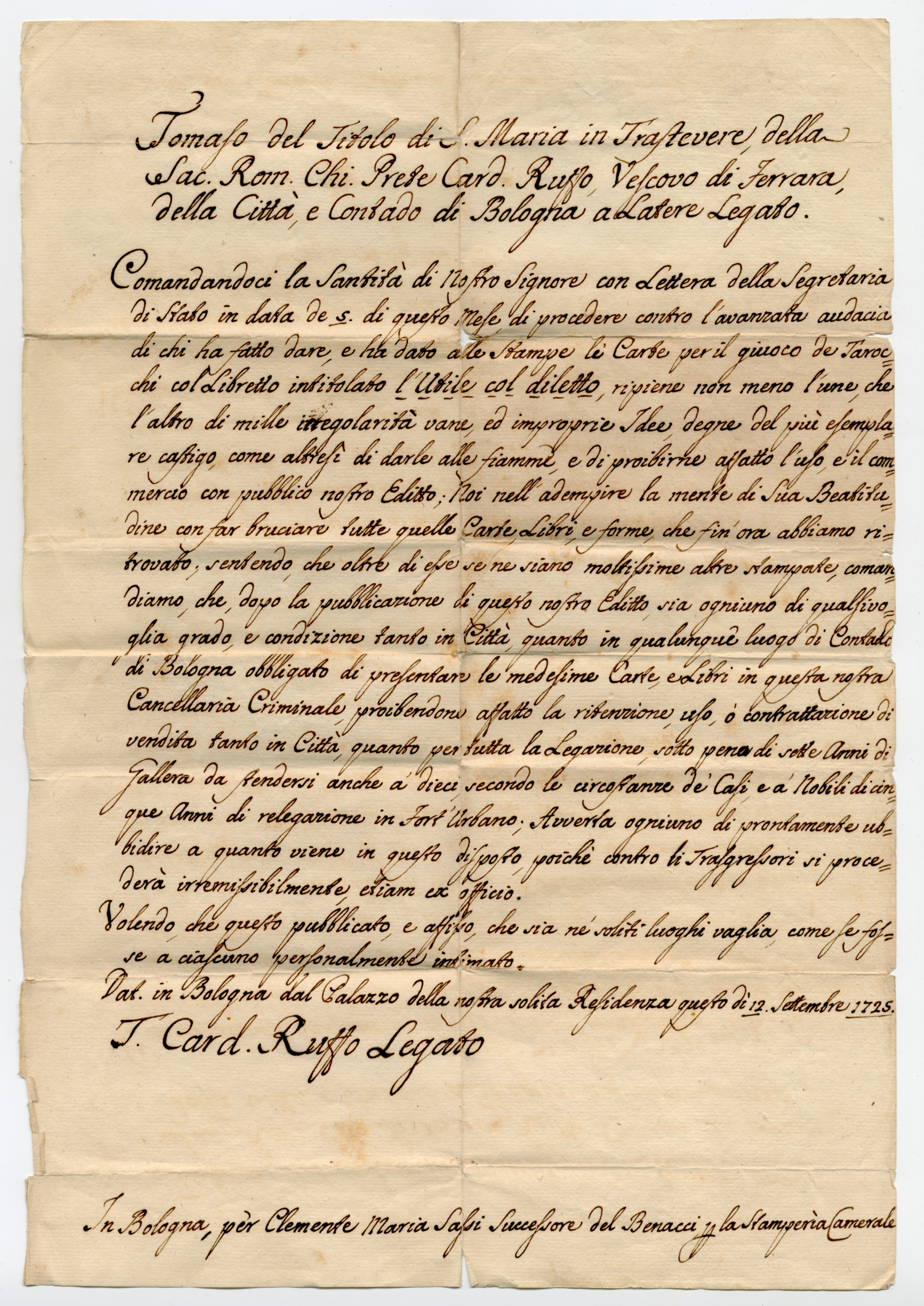 Il patrimonio dell'Archiginnasio testimonia come la censura colpisse anche documenti non librari. La biblioteca possiede ben tre esemplari di un rarissimo mazzo di carte da gioco che intreccia il gioco dei tarocchi con la geografia di tutto il mondo e i blasoni e le insegne nobili di Bologna, inventato dal canonico Luigi Montieri e prodotto dallo stampatore Lelio Dalla Volpe, nella cui bottega sotto il Portico della Morte si riuniva un cenacolo culturale estremamente vivace. L'intento pedagogico appare chiaro fin dal titolo: L'utile col diletto, o sia geografia intrecciata nel giuoco de tarocchi con le insegne degl'illustrissimi, ed eccelsi signori gonfalonieri, ed anziani di Bologna dal 1670, fino al 1725 (il mazzo è integralmente visibile online).