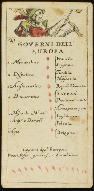 Le ragioni della condanna alla distruzione di un mazzo di carte ritenute piene di «... mille irregolarità vane, ed improprie idee, degne del più esemplare castigo...» si trovano nella carta numero 21, dove il governo di Bologna viene definito «misto».