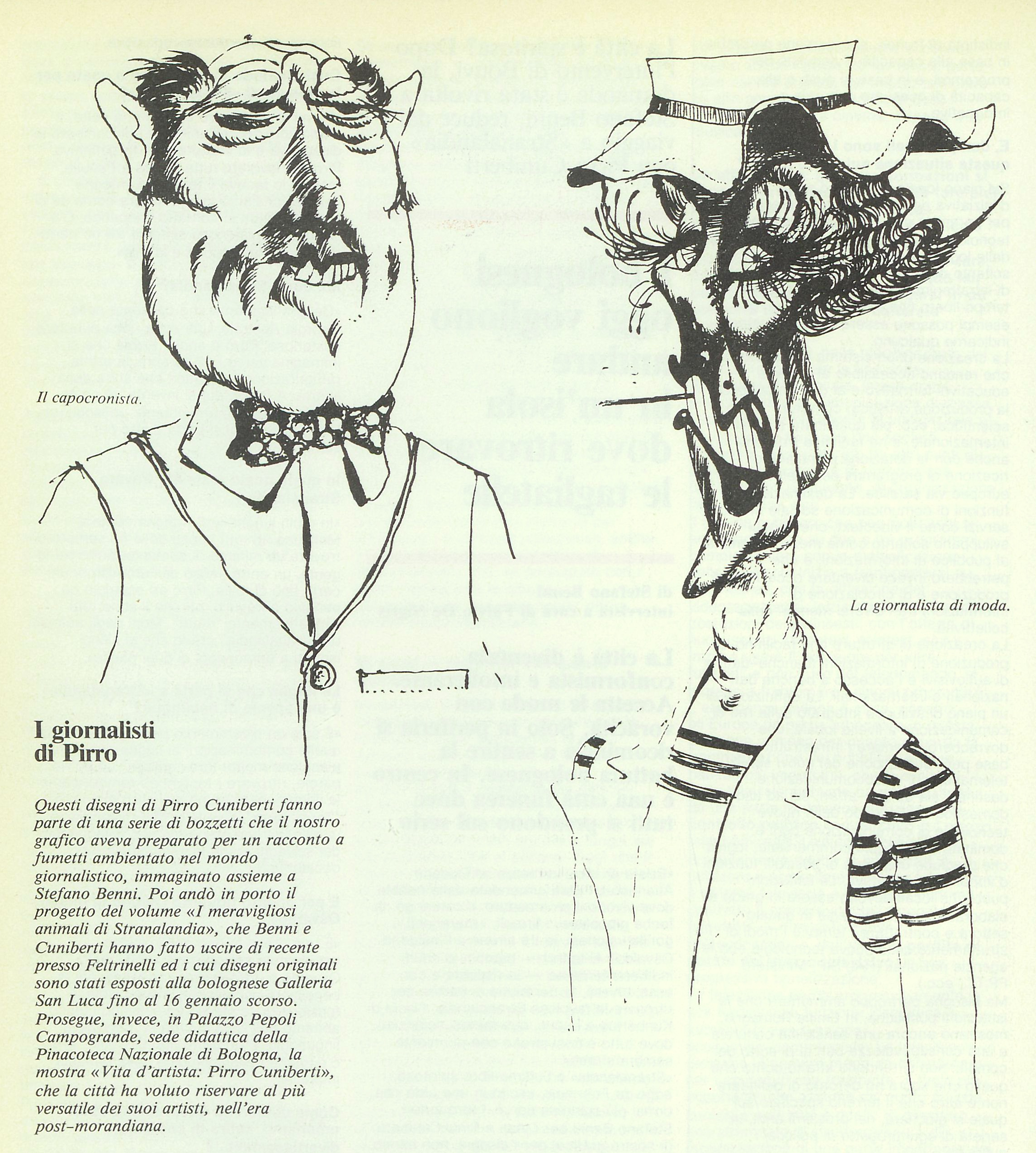 Questi disegni di Pirro Cuniberti fanno parte di una serie di bozzetti che il nostro grafico [Cuniberti curava in quel momento la grafica del periodico, N.d.R.] aveva preparato per un racconto a fumetti ambientato nel mondo giornalistico, immaginato insieme a Stefano Benni. Poi andò in porto il progetto del volume “I meravigliosi animali di Stranalandia”, che Benni e Cuniberti hanno fatto uscire di recente presso Feltrinelli ed i cui disegni originali sono stati esposti alla bolognese Galleria San Luca fino al 16 gennaio scorso. Prosegue, invece, in Palazzo Pepoli Campogrande, sede didattica della Pinacoteca Nazionale di Bologna, la mostra “Vita d’artista: Pirro Cuniberti”, che la città ha voluto riservare al più versatile dei suoi artisti, nell’era post-morandiana».