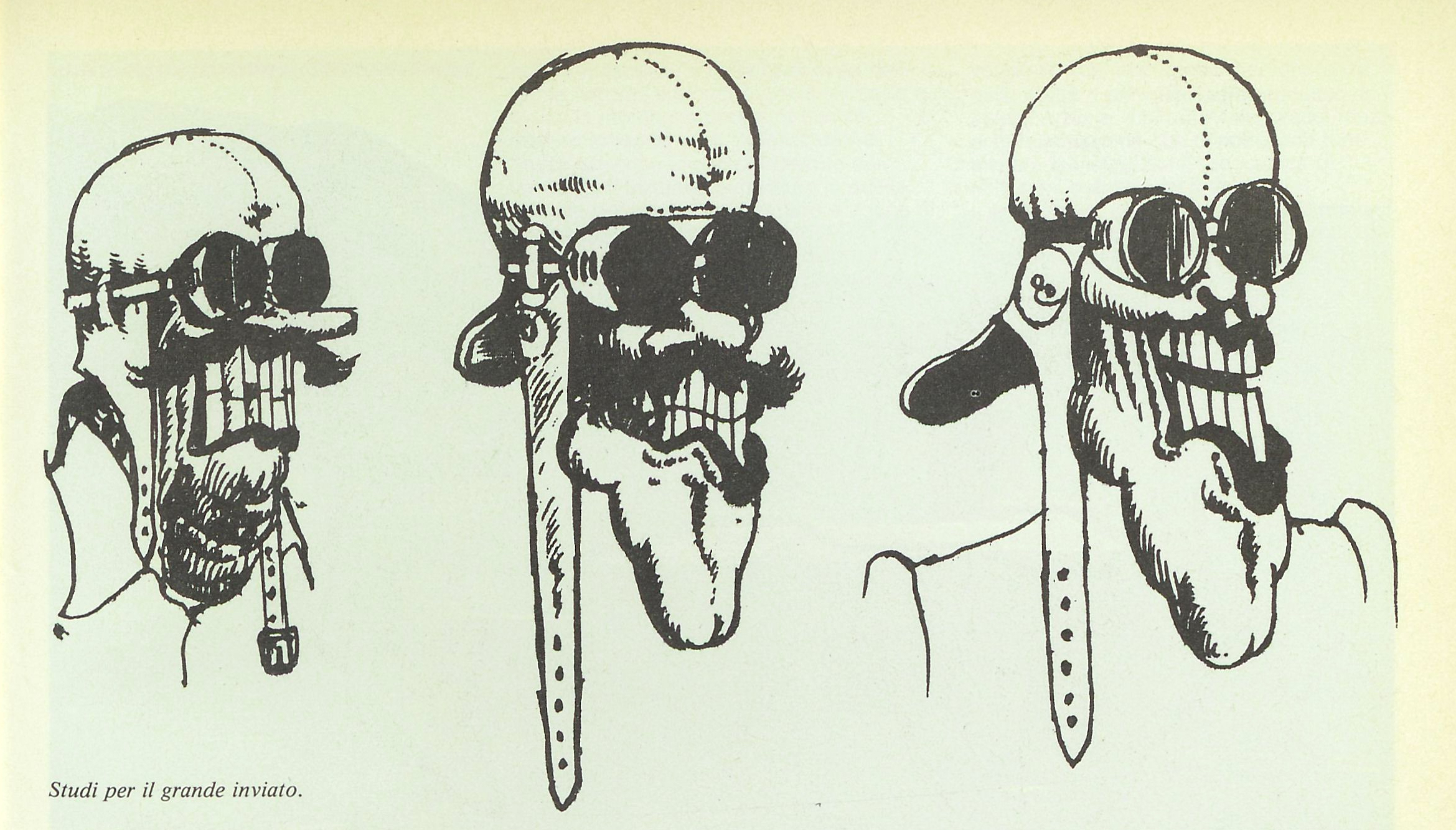 Ma la notizia che più ci interessa è che la prima idea di collaborazione fra Benni e Cuniberti non ruotava intorno a un libro illlustrato, ma a un vero e proprio fumetto. Il secondo aveva anche già preparato dei bozzetti di personaggi: oltre a quelli che vediamo qui, le pagine dell’intervista presentano anche degli «Studi per il grande inviato».